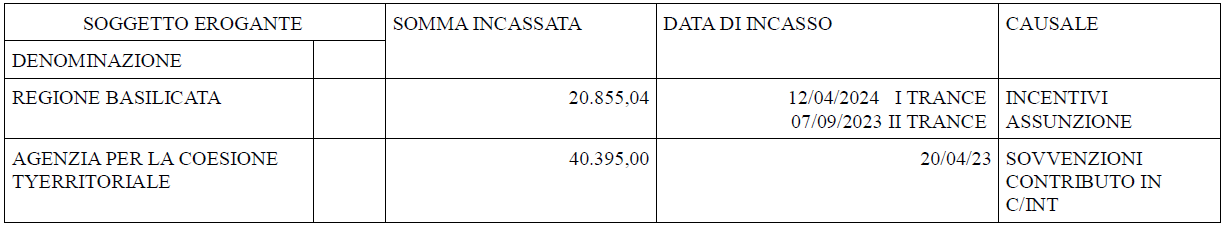 Ai sensi dell’art. 1, comma 125-bis , legge n. 124/2017 si segnala che l’impresa ha ricevuto , nel corso dell’esercizio 2023 , sovvenzioni, sussidi , vantaggi , contributi e aiuti pubblici in denaro o in natura, dettagliati nella seguente tabella: